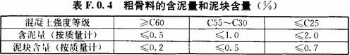 F.0.4 粗骨料的含泥量和泥塊含量應符合表F.0.4的規(guī)定。