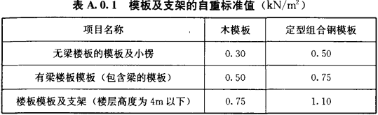 A.0.1 模板及支架自重(G1)的標準值應根據模板施工圖確定。有梁樓板及無梁樓板的模板及支架自重的標準值,可按表A.0.1采用。