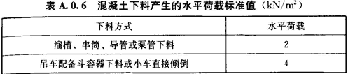 A.0.6 混凝土下料產生的水平荷載(Q2)的標準值可按表A.0.6采用,其作用范圍可取為新澆筑混凝土側壓力的有效壓頭高度h之內。