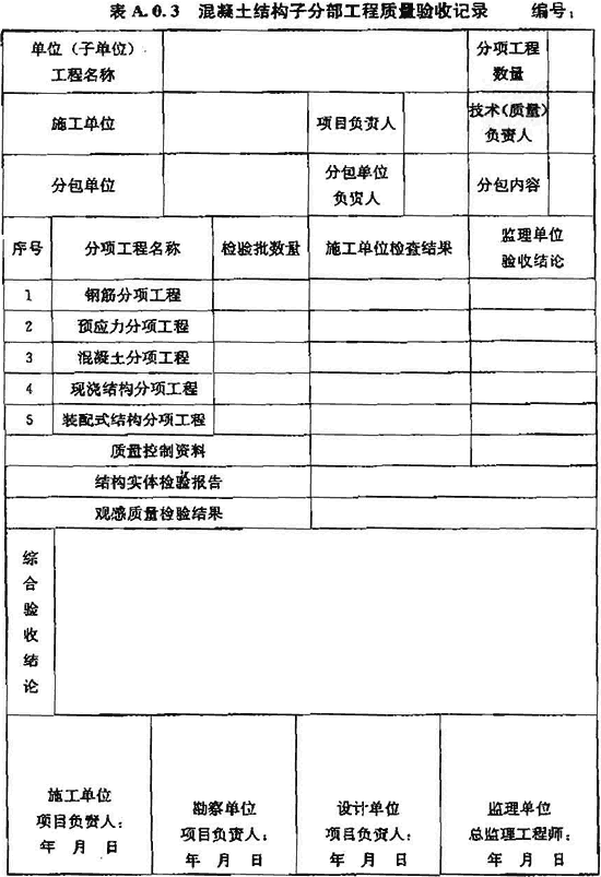 3.0.9 檢驗批、分項工程、混凝土結(jié)構(gòu)子分部工程的質(zhì)量驗收可按本規(guī)范附錄A記錄。
