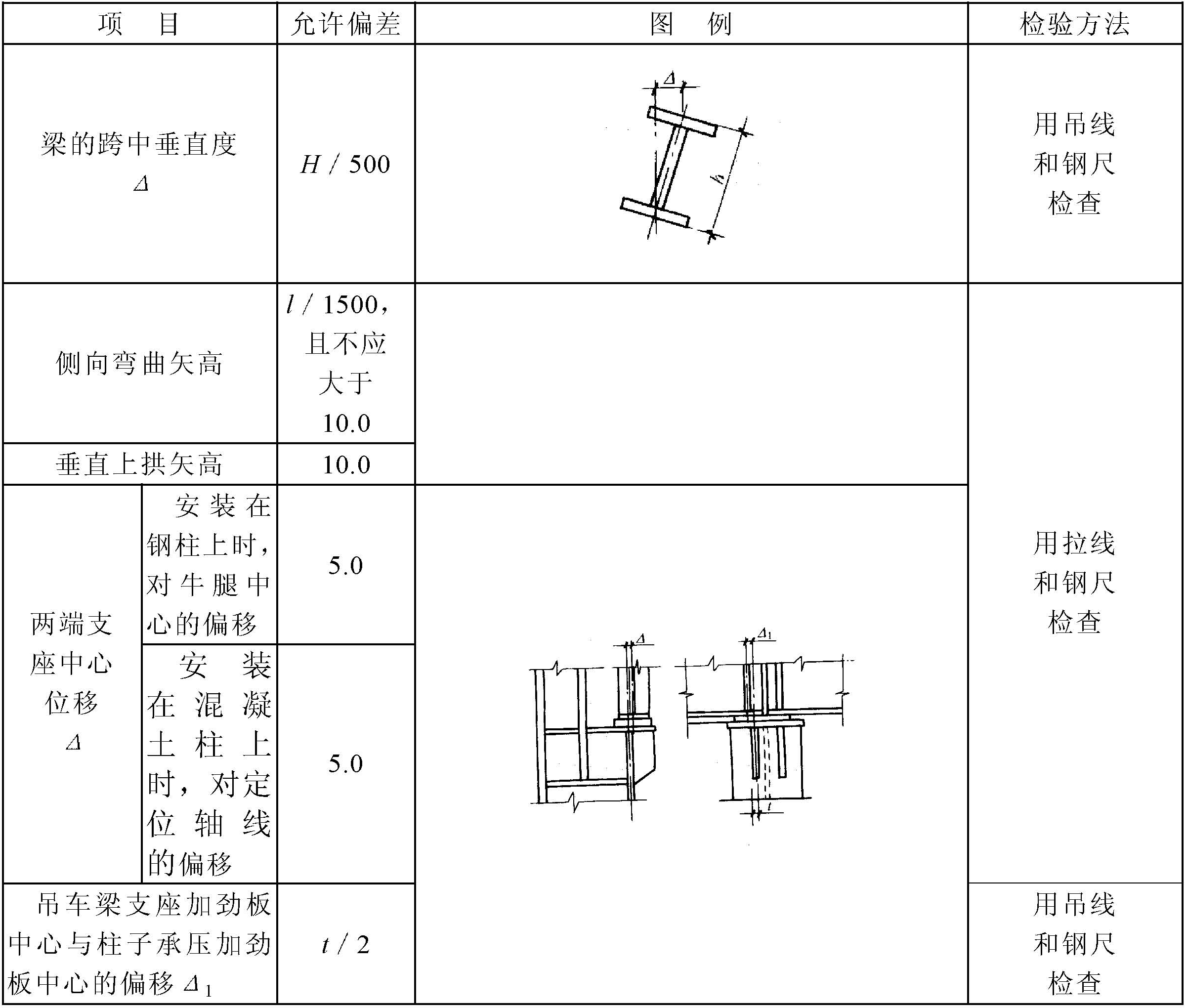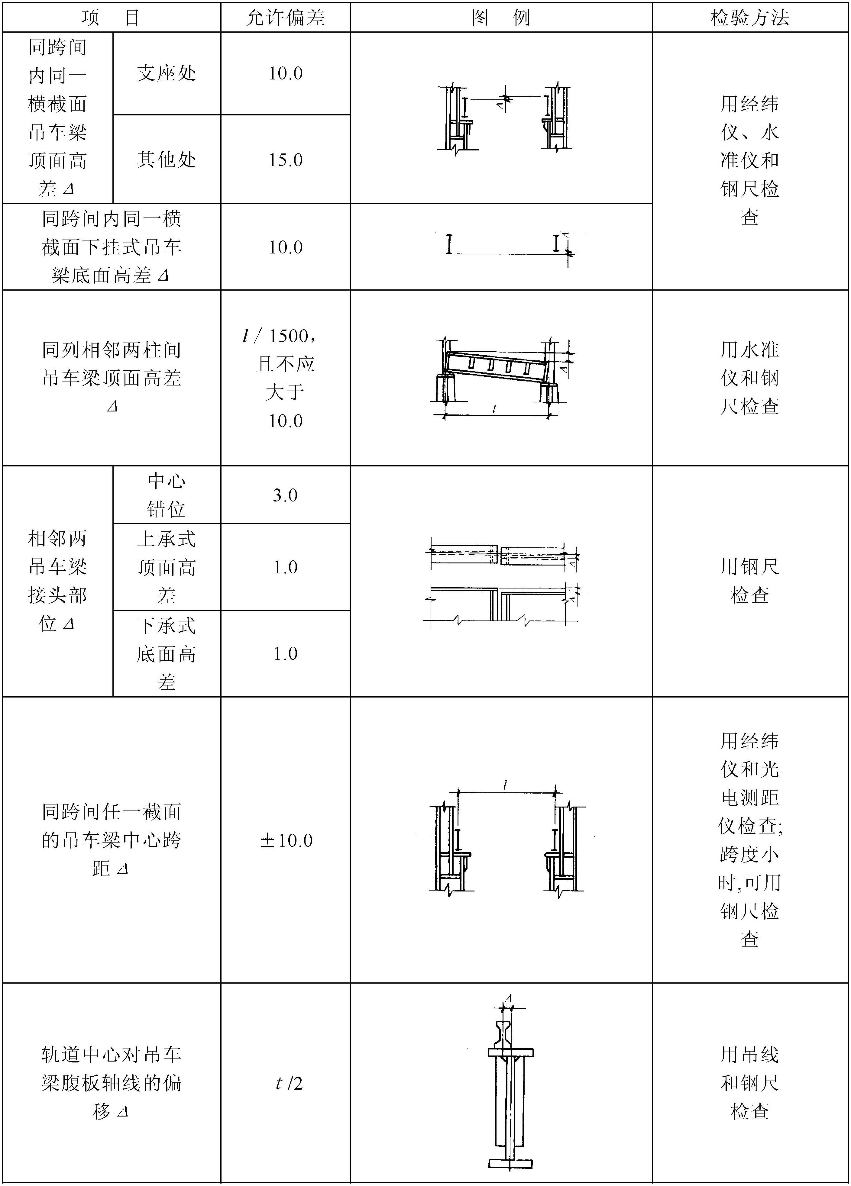 E.0.2 鋼吊車梁安裝的允許偏差應(yīng)符合表E.0.2的規(guī)定。