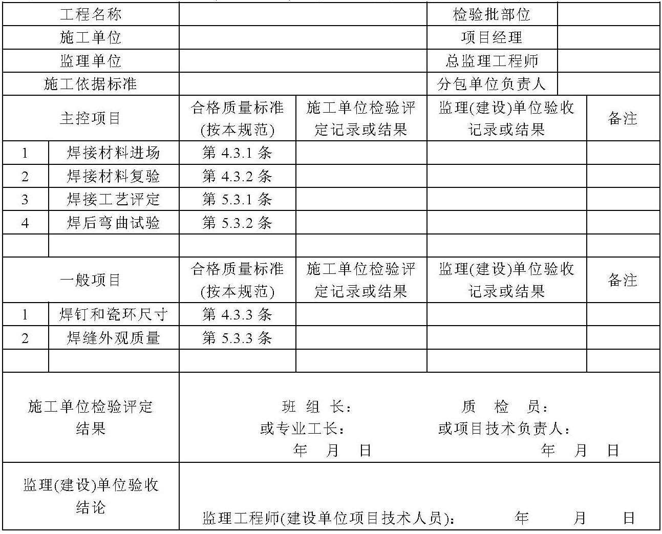 表J.0.2 鋼結(jié)構(gòu)(焊釘焊接)分項(xiàng)工程檢驗(yàn)批質(zhì)量驗(yàn)收記錄