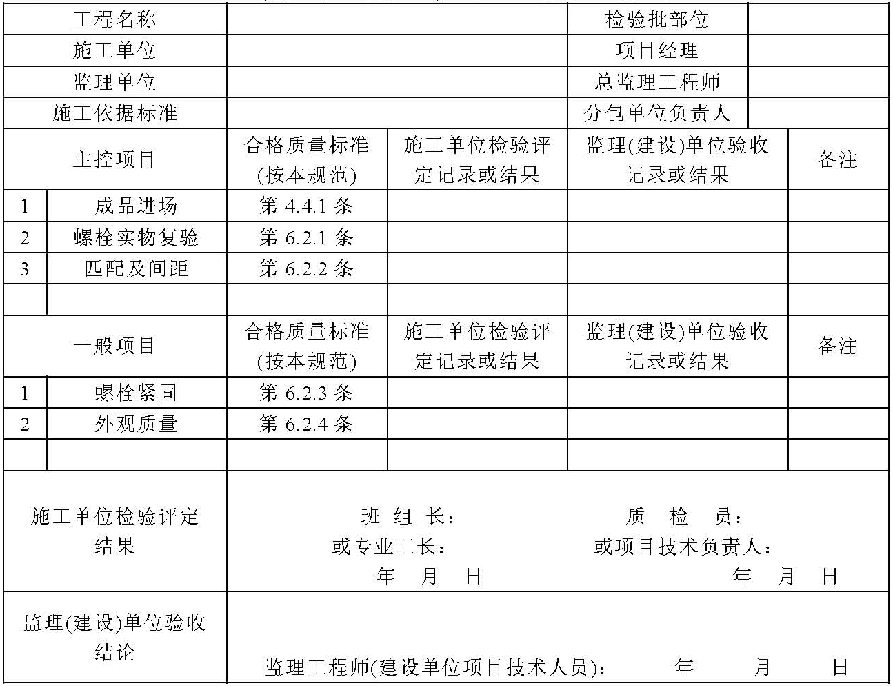 J.0.4 鋼結(jié)構(gòu)(高強(qiáng)度螺栓連接)分項(xiàng)工程檢驗(yàn)批質(zhì)量驗(yàn)收應(yīng)按表J.0.4進(jìn)行記錄。