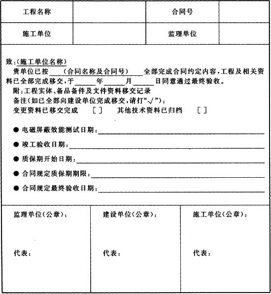 表D.0.2 電磁屏蔽室工程竣工驗收證書