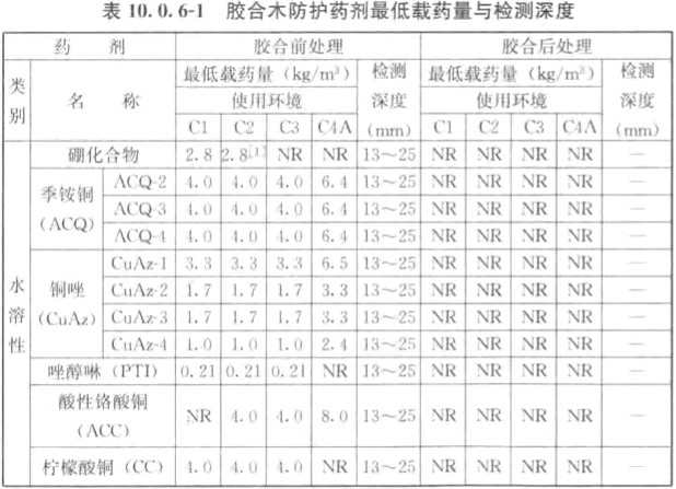 10.0.6 膠合木結(jié)構(gòu)宜在化學(xué)藥劑處理前膠合,并宜采用油溶性防護(hù)劑以防吸水變形,必要時(shí)也可先處理后膠合。經(jīng)化學(xué)防腐處理后在不同使用環(huán)境下膠合木構(gòu)什的藥劑最低保持量及其透入度,應(yīng)分別不小于表10.0.6-1和表10.0.6-2 的覘定。檢測(cè)方法應(yīng)符合本規(guī)范第10.0.5條的規(guī)定。