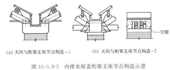5 屋盞系統(tǒng)的內(nèi)排水天溝應(yīng)避開(kāi)桁架端節(jié)點(diǎn)設(shè)置[圖10.0.8-2 (a)]或架空設(shè)置[圖10.0.8-2(b)],并應(yīng)避免天淘滲漏雨水而浸泡桁架端節(jié)點(diǎn)。