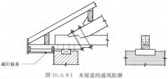 2 木屋蓋下設(shè)吊頂頂棚形成悶頂時(shí),尾蓋系統(tǒng)應(yīng)設(shè)老虎窗或山墻百葉窗,也可設(shè)檐口疏釘板條(圖10.0.8-1)。
