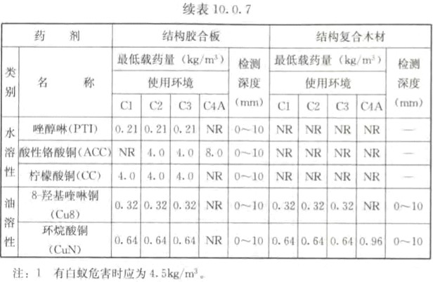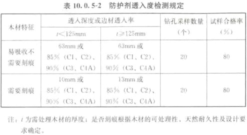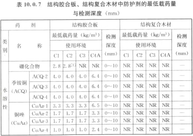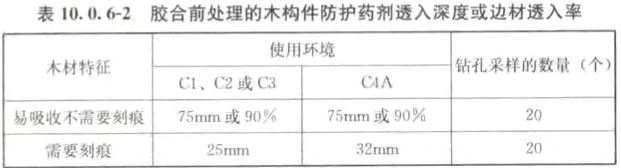 10.0.7 經(jīng)化學(xué)防腐處理后的結(jié)構(gòu)膠合板和結(jié)構(gòu)復(fù)合木材,其防護(hù)劑的最低保持量及其透入度不應(yīng)低于表10.0.7的規(guī)定。