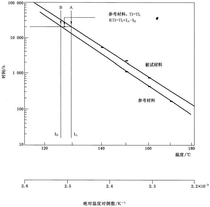 “在某一對比試驗中,當待評材料和參照材料經(jīng)受相同的老化和診斷程序時,從對應(yīng)于某一參照材料的已知溫度指數(shù)獲得的待評材料的溫度指數(shù)(見圖4)”。