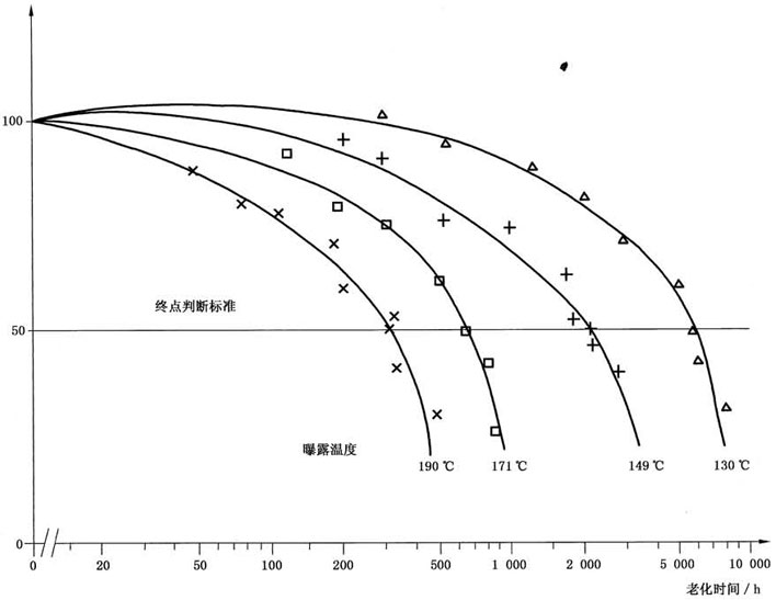 選擇終點最好能反映絕緣材料劣化的程度,即這種劣化降低了材料在某一絕緣系統(tǒng)中實際運行時承受某種應(yīng)力的能力。作為表明試驗達到終點的性能劣化程度最好與實際應(yīng)用中所要求的材料性能允許安全值有關(guān)。
