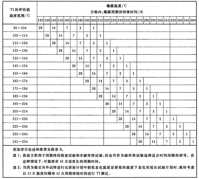 表1是供計劃進行耐熱試驗時選擇老化溫度和周期持續(xù)時間用的。表1中的行是與所評估的TI相對應(yīng),它表示在烘箱溫度下,建議的老化時間(天),烘箱溫度列在相應(yīng)欄的頂部??梢愿鶕?jù)老化試驗的初期結(jié)果,調(diào)節(jié)老化周期或外加老化溫度。