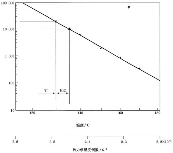 對TI測定,宜把試樣曝露于不少三個、最好四個或以上的溫度下,這些溫度應(yīng)包含有足夠范圍,以便能證明到達終點時間與熱力學(絕對)溫度倒數(shù)之間的線性關(guān)系。