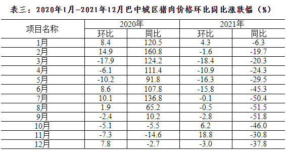 3.豬肉價格連續(xù)下降。2021年,巴中城區(qū)豬肉價格下降37.8%,對CPI的下拉作用約為1.11個百分點。從月度同比來看,從上年10月份巴中豬肉價格下降5.5%,扭轉(zhuǎn)了連續(xù)23個月的上漲行情;今年以來,受上年同期基數(shù)較高以及生豬出欄逐步恢復(fù)、豬肉市場有效供給量增加等因素影響,豬肉價格呈持續(xù)下行態(tài)勢嗎。2021年1月—12月,豬肉價格同比分別下降6.3%、19.7%、20.3%、24.3%、29.5%、46.3%、50.4%、51.5%、51.8%、46%、30.8%和37.8%,其中2021年6月—10月豬肉價格同比降幅超45%。(見表三)