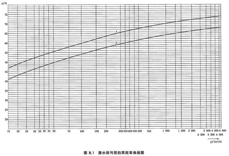 B.1 潛水排污泵在清潔冷水中進行試驗,測得的效率曲線見圖B.1,其中曲線B為旋流式葉輪的泵效率,曲線A為其他型式葉輪的泵效率。在規(guī)定的流量下泵的效率不應低于圖B.1的規(guī)定。