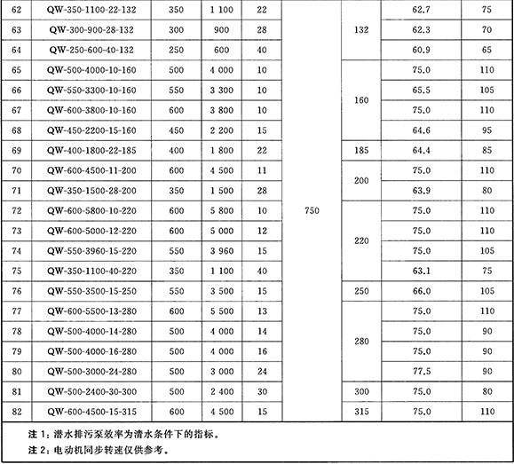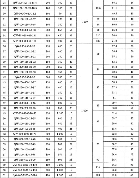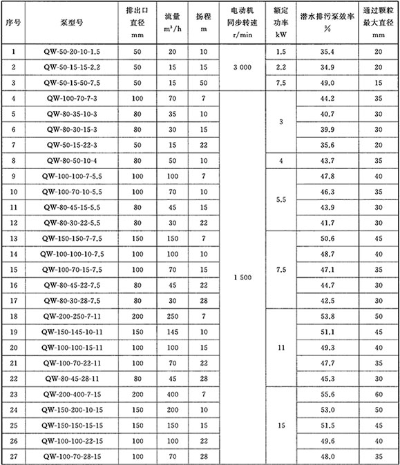 A.1 潛水排污泵在頻率為50Hz,電壓為380V時,規(guī)定點參數(shù)應符合表A.1的規(guī)定。