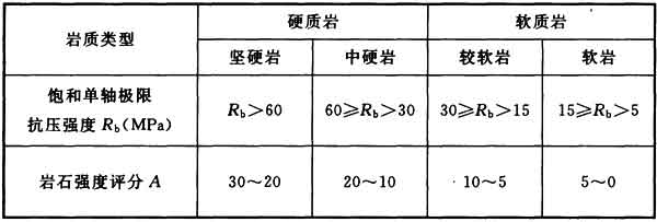 注:1 當(dāng)巖石飽和單軸抗壓強(qiáng)度大于100MPa時(shí),巖石強(qiáng)度的評(píng)分為30;2 當(dāng)巖體完整程度與結(jié)構(gòu)面狀態(tài)評(píng)分之和小于5,且?guī)r石強(qiáng)度評(píng)分大于20時(shí),按20評(píng)分。