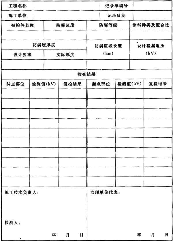 表B.0.18 防腐絕緣層電火花檢漏記錄