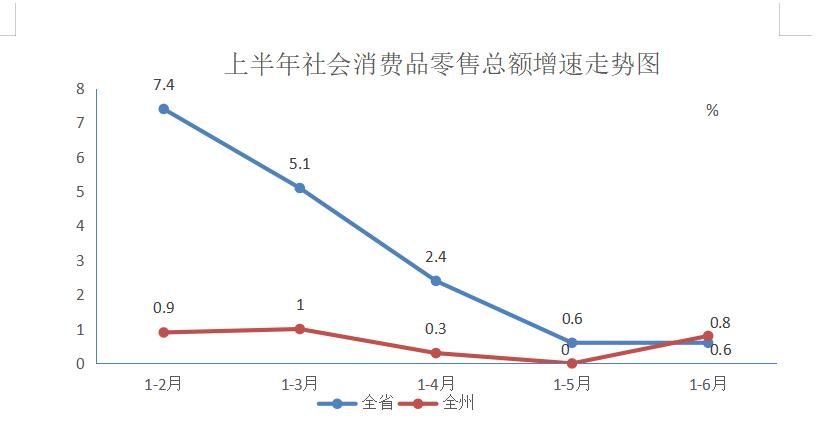 上半年,全州消費品市場呈現加速增長、穩(wěn)中向好發(fā)展態(tài)勢。全州實現社會消費品零售總額56.99億元,增長0.8%,其中:限額以上實現零售額13.99億元,增長11.8%;限額以下實現零售額43億元,下降3.2%。資料下載_統(tǒng)計公報_工作報告