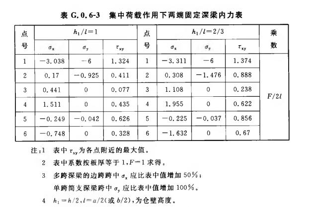3髙壁淺倉或深倉倉壁可按平面深梁計算,略去漏斗壁的共同受力作用。平面深梁的計算表格見表G.0.6-1 表G.0.7-2。 4選擇鋼筋截面時,按平面內(nèi)彎曲算出的水平應力應與按表G.0.6-1 表G.0.7-2所計算出的水平力同時考慮。