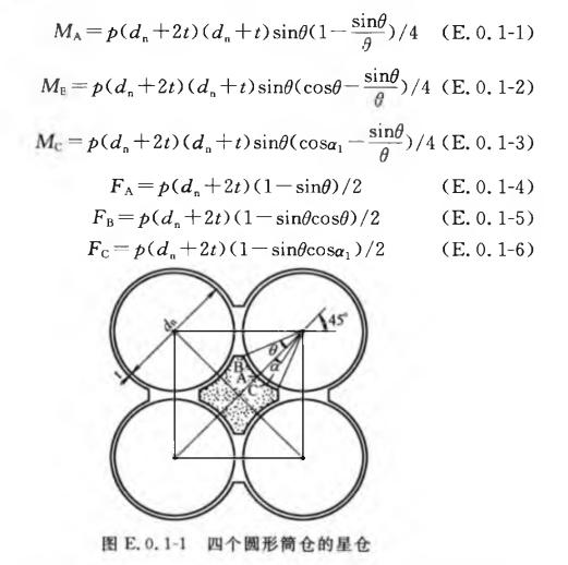 E.0.1 四個圓形筒倉的星倉倉壁內(nèi)力(圖E.0.1-1)計算公式: