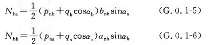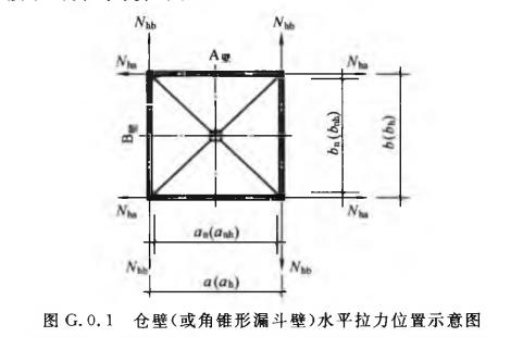 G.0.1對稱布置的矩形筒倉倉壁或角錐形漏斗壁,在貯料水平壓力或貯料法向壓力及漏斗壁自重作用下,由鄰壁傳來的水平拉力可按下列公式計算(圖G.0.1):