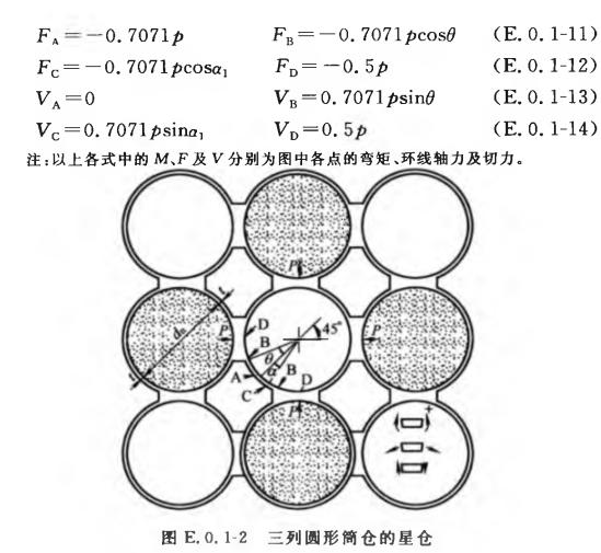 三列圓形筒倉的星倉倉壁中的內(nèi)力(圖E.0.1-2)計算公式: