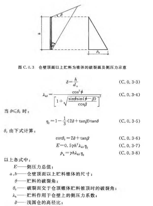 C.0.1當倉壁頂面以上的貯料為錐體,破裂面通過倉的中線(圖C.0.1)時,貯料作用于淺圓倉倉壁上的側(cè)壓力可按下式計算: