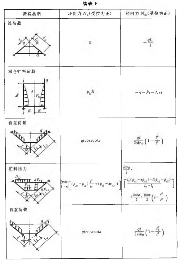 G.0.2對稱布置的矩形筒倉倉壁或角錐形漏斗壁,在貯料荷載、結(jié)構(gòu)自重等豎向荷載作用下,產(chǎn)生的豎向力或斜向力可按下列公式算: