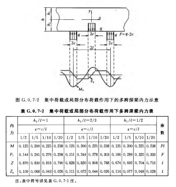 2集中荷載或局部分布荷載作用下的多跨深梁如圖G.0.7-2所示,其內(nèi)力計算見表G.0.7-2。