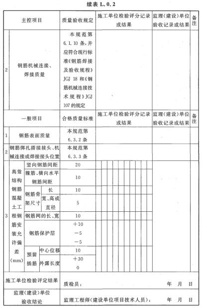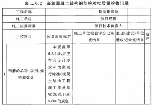 L.0.2 高聳混凝土結(jié)構(gòu)鋼筋檢驗批質(zhì)量驗收應(yīng)按表L.0.2進行記錄。