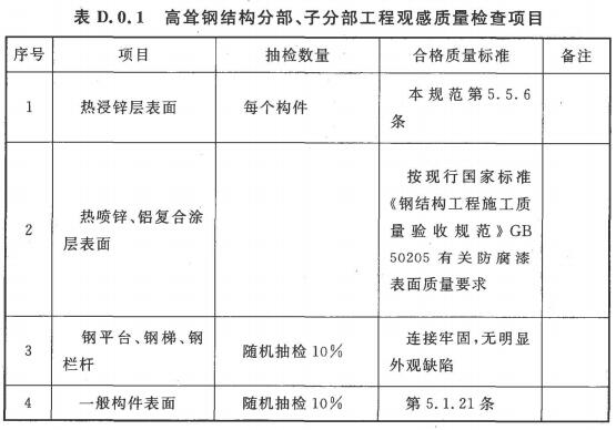 D.0.1高聳鋼結(jié)構(gòu)分部、子分部工程觀感質(zhì)量檢查應(yīng)按表D.0.1規(guī)定的項目進行。