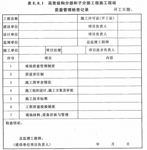 E.0.1高聳結(jié)構(gòu)分部和子分部工程施工現(xiàn)場質(zhì)量管理檢查記錄應(yīng)由施工單位按表E.0.1填寫,總監(jiān)理工程師或建設(shè)單位項目負責人進行檢查,并做出檢查結(jié)論。
