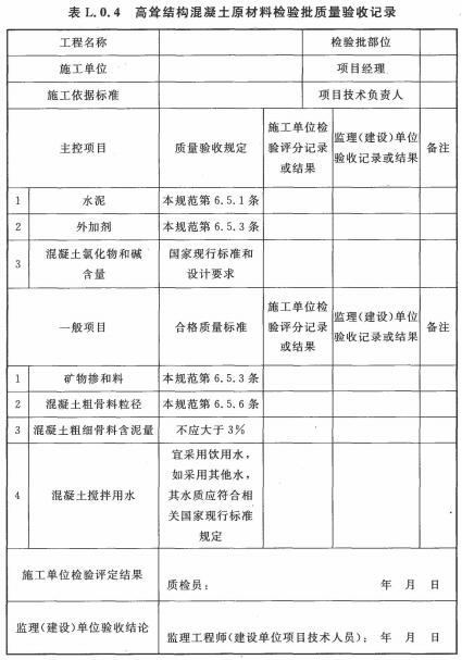 L.0.4 高聳結(jié)構(gòu)混凝土原材料檢驗批質(zhì)量驗收應(yīng)按表L.0.4進行記錄。