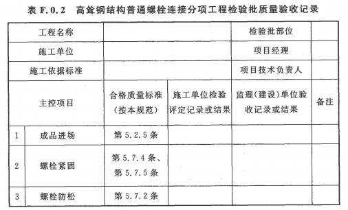 F.0.2 高聳鋼結(jié)構(gòu)普通螺栓連接分項工程檢驗批質(zhì)量驗收應(yīng)按表F.0.2進行記錄。