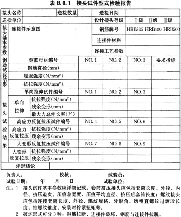 B.0.1 接頭試件型式檢驗(yàn)報(bào)告應(yīng)包括試件基本參數(shù)和試驗(yàn)結(jié)果兩部分。宜按表B.0.1的格式記錄。