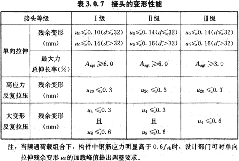 3.0.4 接頭應(yīng)根據(jù)抗拉強(qiáng)度、殘余變形以及高應(yīng)力和大變形條件下反復(fù)拉壓性能的差異,分為下列三個(gè)性能等級(jí):