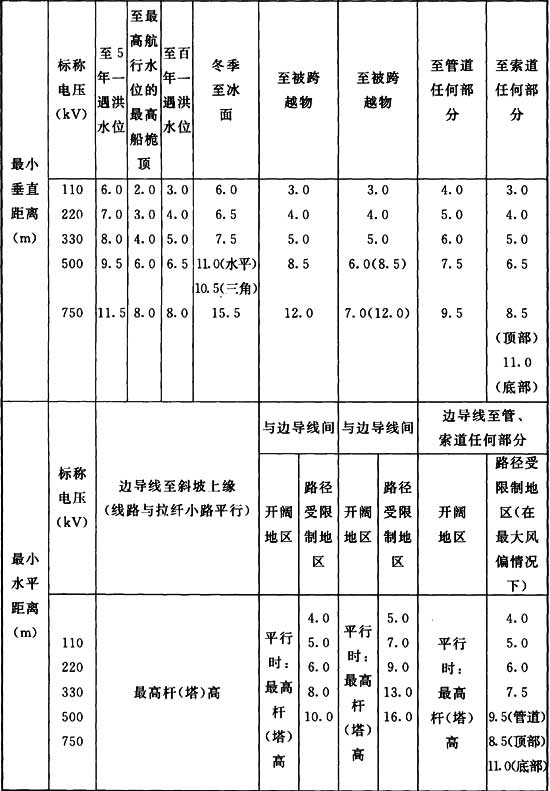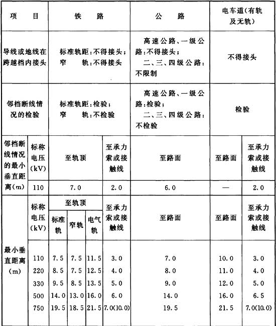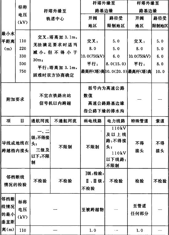 A.0.6 輸電線路與鐵路、公路、河流、管道、索道及各種架空線路交叉或接近距離的基本要求,應(yīng)符合表A.0.6的規(guī)定。