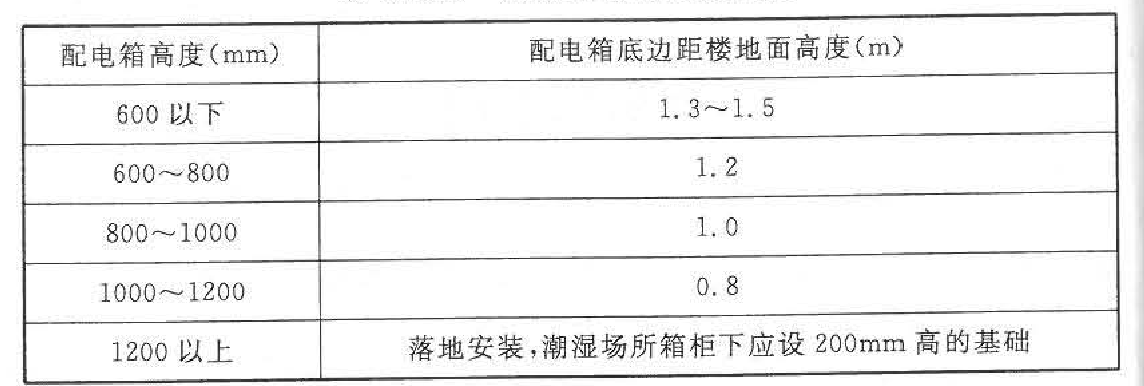 6 箱(板)安裝應(yīng)牢固,垂直度偏差不應(yīng)大于1.5‰。照明配電板底邊距樓地面高度不應(yīng)小于1.8m;當(dāng)設(shè)計無要求時,照明配電箱安裝高度宜符合表6.0.3的規(guī)定;