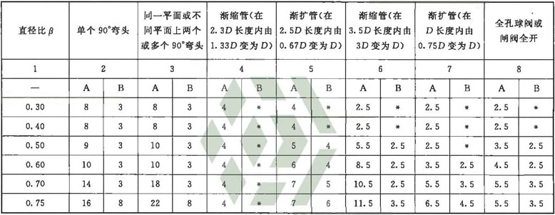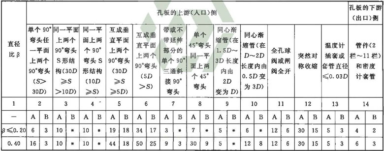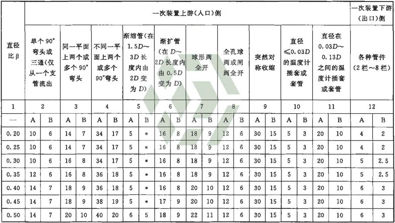 注:1 表中數(shù)值以管道內(nèi)徑D的倍數(shù)表示。直管段應從最近的彎頭彎曲部分的下游端或從漸縮管或漸擴管的彎曲或圓錐部分的下游端測量到經(jīng)典文丘里管的上游取壓口平面。
