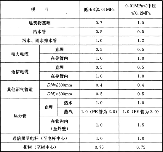 表C.0.1 埋地沼氣管道與建(構(gòu))筑物或相鄰管道之間的水平凈距(m)