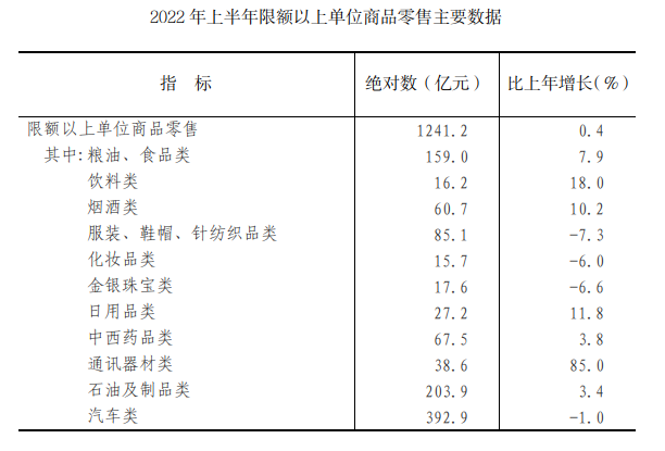上半年,全省社會(huì)消費(fèi)品零售總額3585.8億元,同比下降1.4%。其中限額以上單位消費(fèi)品零售額1310.5億元,同比增長(zhǎng)0.5%