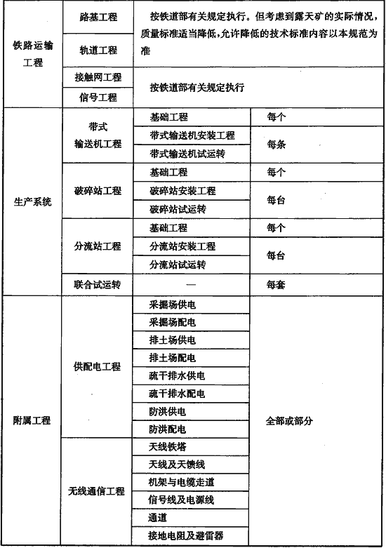 1 單位工程可按露天煤礦工程和類型劃分為疏干工程、防排水工程、邊坡工程、穿爆工程、采剝工程、排土工程、道路工程、鐵路運(yùn)輸工程、生產(chǎn)系統(tǒng)工程和附屬工程。
