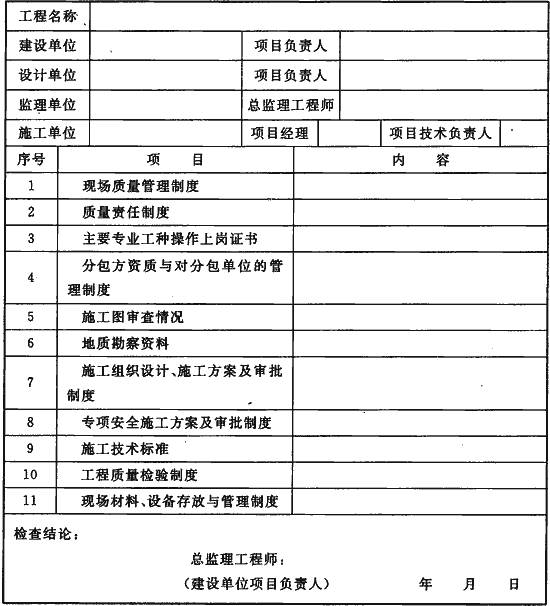 注:施工現(xiàn)場質(zhì)量管理檢查記錄應(yīng)由施工單位按本表填寫,由總監(jiān)理工程師(建設(shè)單位項(xiàng)目負(fù)責(zé)人)進(jìn)行檢查,并作出檢查結(jié)論。