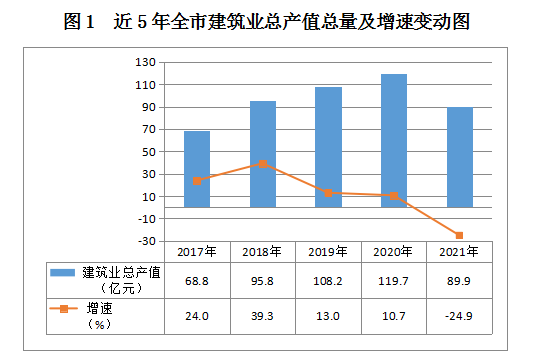 2021年,全市資質(zhì)以上總承包和專業(yè)承包建筑業(yè)企業(yè)171家,較去年增加35家,增長25.7%,有工作量的147家,占全部資質(zhì)以上企業(yè)的86.0%。完成產(chǎn)值89.9億元,下降24.9%,低于去年35.6個百分點,增速較前三個季度分別回落39.5、23.3和1.6個百分點,與排位第一的朔州市和第十位的晉中市分別差50.6和23.7個百分點,增速列全省最后。建筑業(yè)不論是總產(chǎn)值還是增速均處于五年來低位。