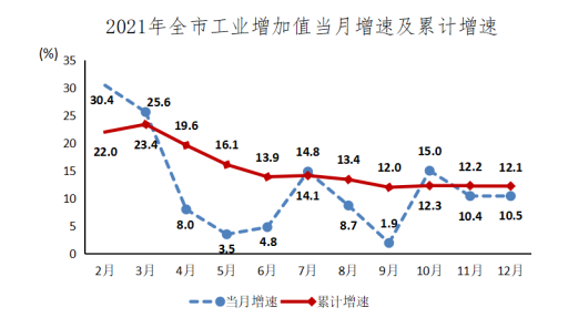 2021年,全市規(guī)模以上工業(yè)增加值同比增長12.1%,低于全?。?2.7%)0.6個百分點(diǎn),高于全國(9.6%)2.5個百分點(diǎn),列全省第7位。