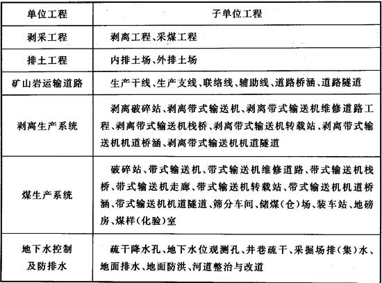 注:由于露天煤礦的建設條件、開采工藝等不盡相同,單位工程內容有所不同,可根據露天煤礦項目建設的具體組成對單位工程的內容進行調整。鐵路工程、選煤廠工程與露天煤礦并列為單項工程,不在本規(guī)范之列。