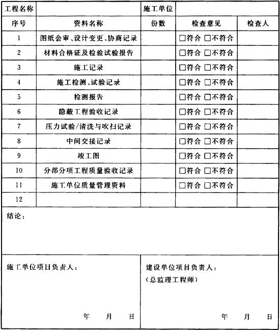 10.0.5 管道工程質(zhì)量驗(yàn)收時(shí),應(yīng)核查施工現(xiàn)場(chǎng)及施工過程中形成的各種施工現(xiàn)場(chǎng)技術(shù)管理文件、施工質(zhì)量記錄等工程資料,資料的格式要求宜符合本規(guī)范附錄A~附錄E的有關(guān)規(guī)定。
