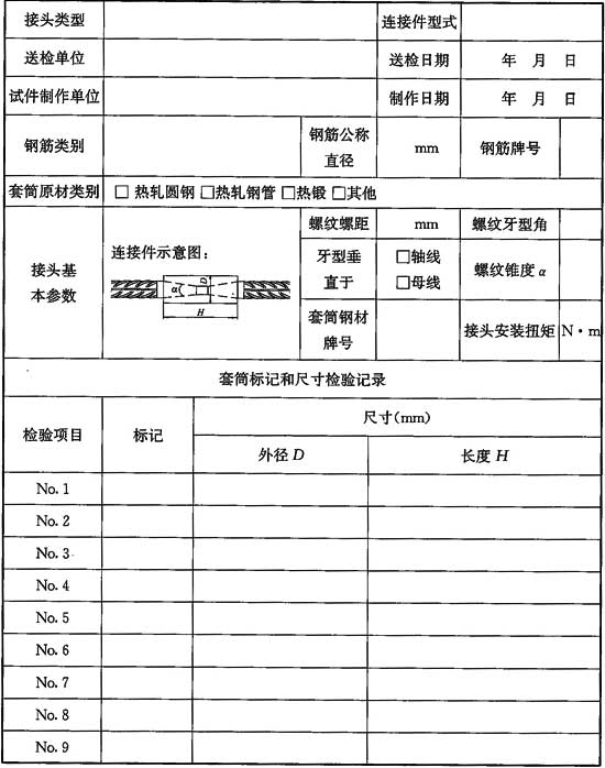 注:1 型式檢驗(yàn)試件用套筒應(yīng)有代表性,應(yīng)從某生產(chǎn)檢驗(yàn)批中隨機(jī)抽樣,檢驗(yàn)單位應(yīng)記錄套筒表面標(biāo)記。