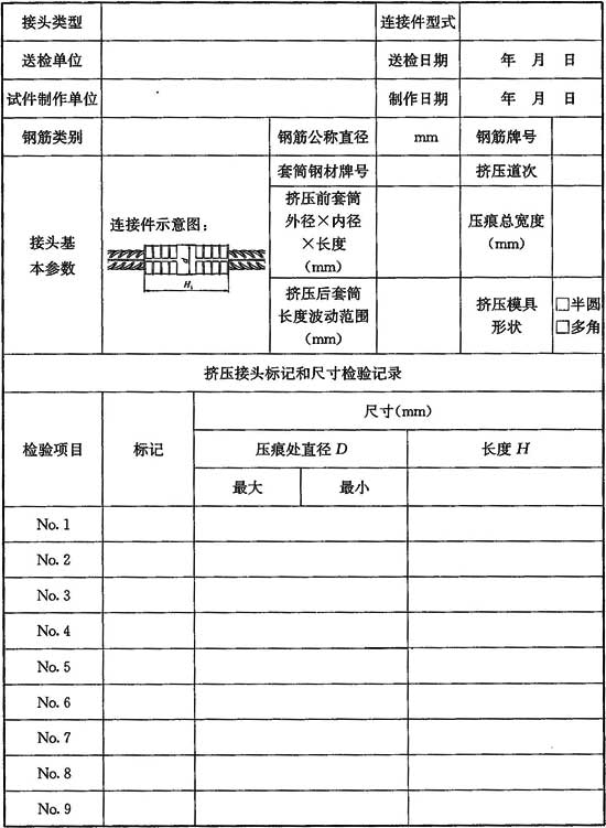 B.0.4 擠壓接頭型式檢驗(yàn)報(bào)告宜按表B.0.4-1、表B.0.4-2的式樣執(zhí)行。