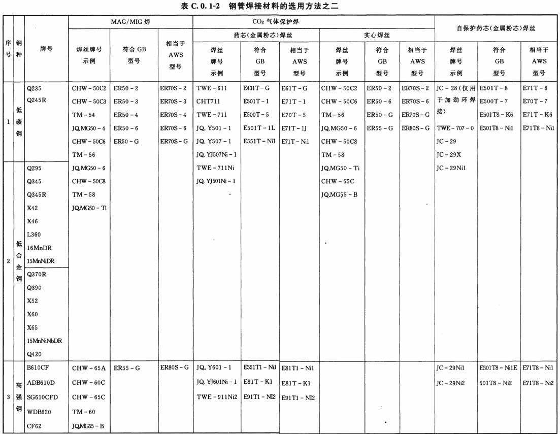 表C.0.1-1 鋼管焊接材料的選用方法之一